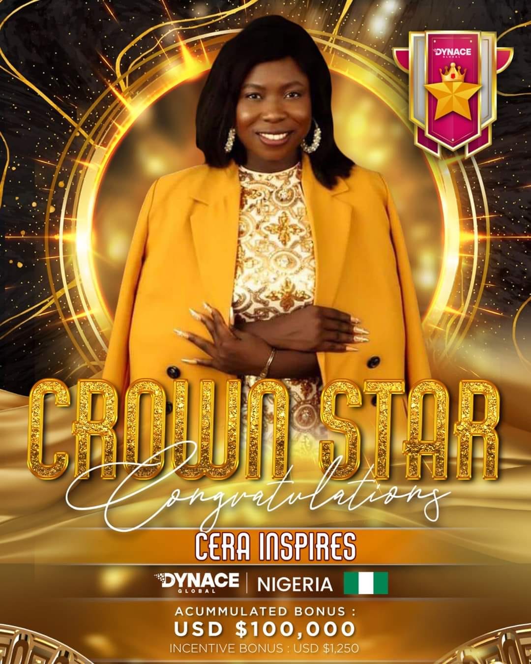 - Cera Inspires Obaje - Nigeria - Crown Star- Dynace Global... Remains A Blessing We Count Twice! The First and Second Crown Stars Have Been Born In One Year Of Operations. Many More Are Loading! As We Lock Hands To Impact The World, You Too Can Join Us By Asking How?